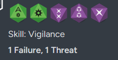 Here, Jack is going to need to make a Vigilance check. Ruby is also, essentially, a Trader, meaning she likely has the same career skills as Jack, but more experienced. So I’ll say it’s a Hard check, meaning there will be three Difficulty dies (the purple ones). I could give Ruby her own character sheet, as she’s probably considered a Nemesis (an NPC that uses the same mechanics as a PC). I’m not quite ready for that yet, so I’ll just do the one sided roll right now.